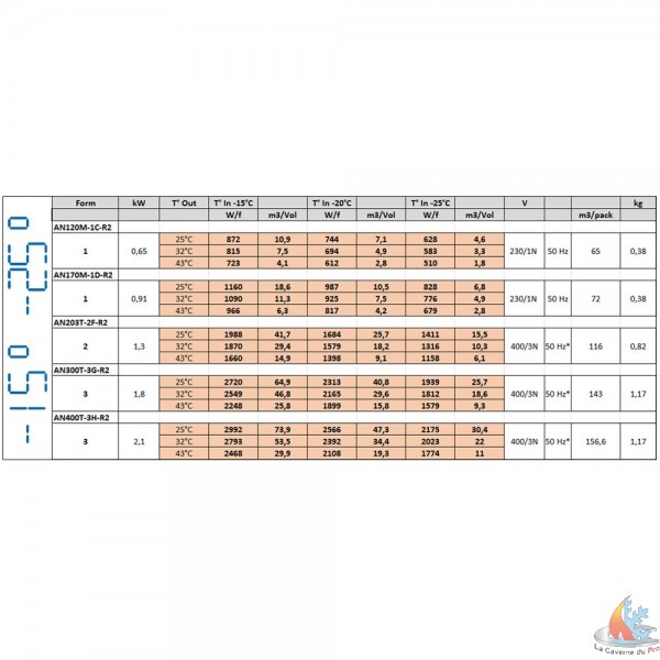 - Puissance frigorifique rendue 694 (W/f) pour chambre volume 4,9m³ / 4900 Lit (T° interne -20° C & T° externe +32° C)