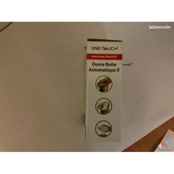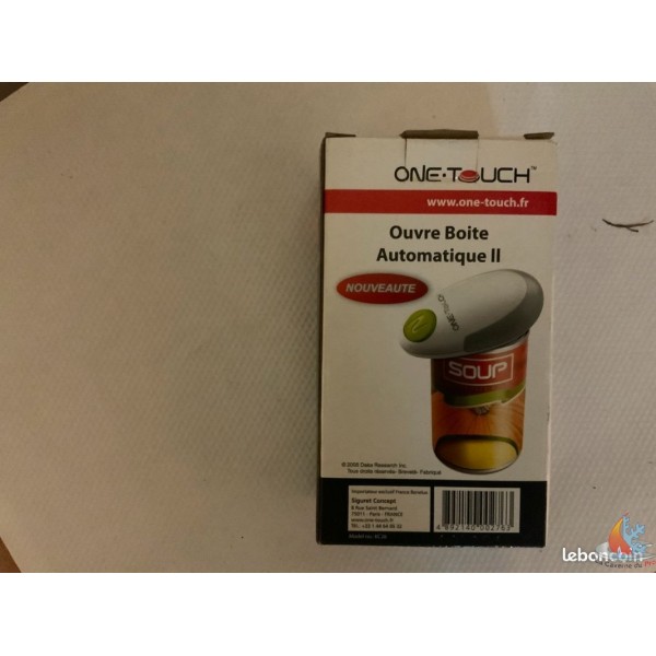 Ouvre boîte automatique - petit format 100% mains libres, ouvre la boîte et s'arrête automatiquement. Le couvercle est soulevé par un aimant et ses bords sont non coupants. Dimensions : L125 x P72 X H50 mm Poids 0,155 Kg Ouvre-boîte One Touch : la façon la plus efficace pour ouvrir les conserves sans effort Aucun effort à faire et aucun risque de coupure L’ouvre-boîte One Touch ouvre toutes les conserves standard grâce à une simple touche Indispensable aux personnes qui souffrent d’arthrite, du syndrome du canal carpien ou de toute autre problème de préhension, il est aussi l’ouvre-boîte idéal de toute la famille, et le seul à fonctionner « mains libres » et en toute sécurité Posé sur la boîte, il fonctionne seul, grâce à une simple touche Découpe le pourtour de la boîte et s'arrête automatiquement Un aimant intelligent permet de soulever le couvercle LE + Laisse les bords du couvercle et de la boîte absolument non tranchants pour une sécurité totale Une mini taille pour une maxi performance Fonctionne avec 2 piles LR06 AA non fournies ---------------------- Réduction sur les lots en un seul colis à partir de 2 articles 2 articles - 5% 3 articles - 5% Articles - 10%