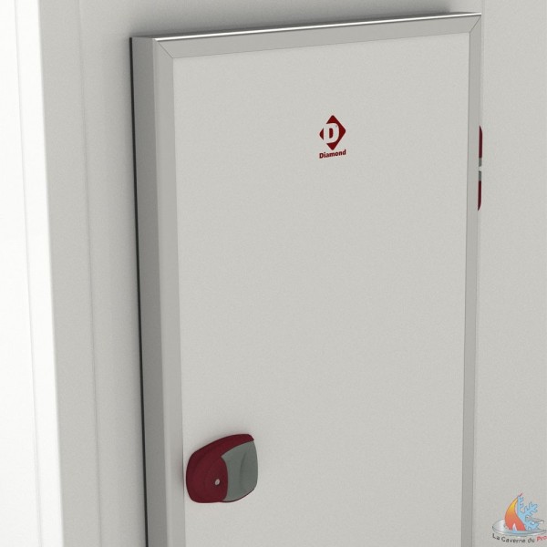 Porte pivotante épaisseur 80mm également isolée avec du polyuréthane (43kg/m3), avec charnières à droite (sur demande, possibilité de charnières à gauche: CGC/BF), très robuste, renforcée avec un encadrement périphérique en aluminium anodisé, munie d'un joint magnétique en EPDM "à pression" (remplacement aisé, sans outillage), charnières montantes réglables et avec arrêt à 100°, poignée extérieure avec serrure à clé, fermeture intérieure avec dispositif de sécurité.