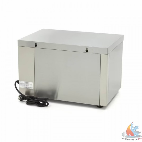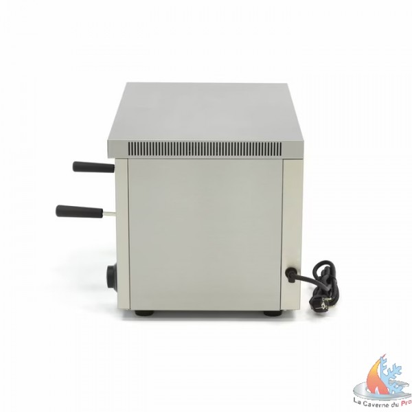 Ce gril salamandre convient pour griller, gratiner, glacer, réchauffer ou décongeler des aliments et des produits. Grâce à sa chaleur homogène, vous pouvez laisser l'appareil à basse température constante. Ce gril est très pratique dans les cuisines professionnelles car il permet de maintenir les plats au chaud après leur préparation. La température peut être réglée à l'aide du bouton rotatif et permet de maintenir les plats au chaud et de cuire lentement le poisson ou la viande.