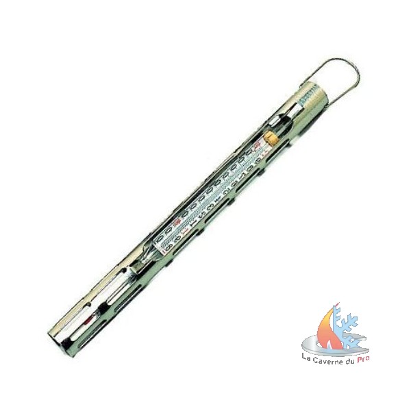 Ce thermomètre est utilisé en confiserie et pâtisserie. Il n'est pas rempli de mercure, mais d'un liquide rouge beaucoup moins toxique. Il est calibré pour être immergé dans toute sa partie fine. La gaine de protection peut être stérilisée à 100°C. Le thermomètre complet passe au lave vaisselle.