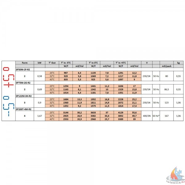 - Puissance frigorifique rendue 1069 (W/f) pour chambre volume 7,2 m³ / 7200 Lit (T° interne 0° - C & T° externe +32° C)