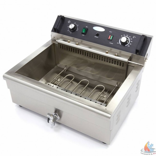 - Cette friteuse d'une capacité de pas moins de 30 litres est un ajout bienvenu dans toute boulangerie, poissonnerie, friterie et autre établissement de restauration. Vous pouvez facilement frire de grandes portions de poisson frais, de frites, de rouleaux de printemps et d'autres snacks en une seule fois. La friteuse possède deux éléments chauffants que vous pouvez contrôler grâce au thermostat de précision. Il suffit de choisir une température entre 50°C et 200°C. Le témoin lumineux orange indique quand l'huile est à la bonne température et que les produits peuvent être frits. Cette friteuse fonctionne sur une alimentation de 400V.
