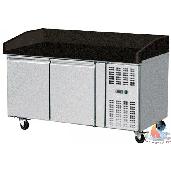 - Equipez vous d'un poste de travail fonctionnel, pratique et fiable, grâce à ce comptoir à pizza deux portes haut de gamme. Ce comptoir de préparation possède deux étagères GN 1/1 et un puissant système de refroidissement à air forcé, offre une grande capacité de stockage et des performances de refroidissement exceptionnelles pour des aliments prêts à être utilisés à tout moment. Plan de travail en marbre dont la surface reste fraîche, pour un pétrissage facile et sans gâchis. La construction en acier inoxydable est conçue pour supporter les rigueurs d'une utilisation commerciale sur la durée.