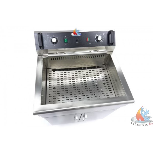 - Si vous souhaitez faire frire de grandes quantités de frites, de snacks, de légumes, de poissons ou autres, cette friteuse polyvalente d'une capacité de 35 litres est parfaite. Elle trouve sa place dans toutes les cuisines de restauration où l'on fait beaucoup de fritures. La friteuse est livrée avec une armoire en acier inoxydable. Grâce à elle, vous pouvez facilement créer une capacité supplémentaire dans votre cuisine sans prendre de place sur un plan de travail ou une table. L'armoire de base est équipée de deux portes en acier inoxydable avec poignées. Un robinet de vidange est fixé à la base pour vous permettre de changer rapidement l'huile. Vous pouvez stocker de l'huile de friture supplémentaire à l'intérieur. La friteuse est livrée avec un couvercle amovible et toutes les poignées sont résistantes à la chaleur. Les résidus de friture sont collectés dans la grille fournie, qui peut être facilement attachée à la friteuse.