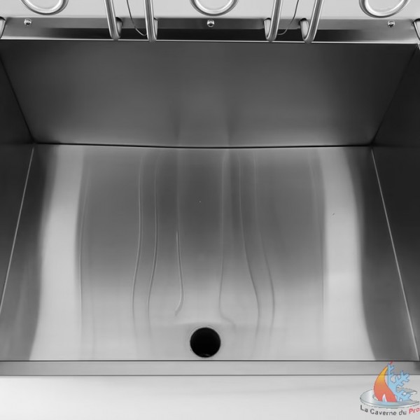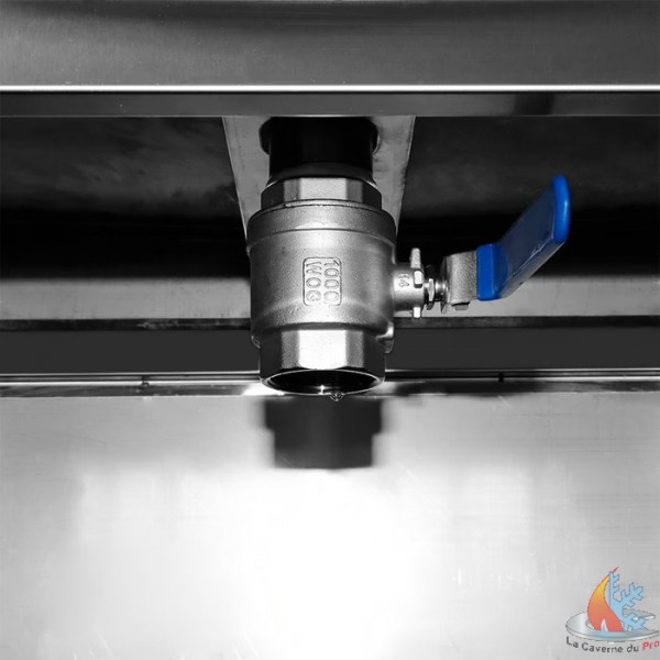 - Cette friteuse est livrée avec un chariot en acier inoxydable très pratique. Celui-ci vous permet de travailler à la hauteur idéale et d'accéder facilement au panier. Sous la friteuse, un grand espace permet d'accéder au robinet de vidange, qui est fixé à la base afin que vous puissiez facilement vidanger l'huile en cas de besoin.