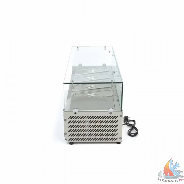 - Cette vitrine de comptoir est idéal pour une utilisation quotidienne intensive dans toute cuisine professionnelle. Quatre récipients GN 1/3 peuvent y être placés pour aider à conserver les ingrédients à la bonne température et prêts à être utilisés à tout moment. Cette vitrine est bien adapté aux tâches telles que le remplissage rapide de sandwichs, l'ajout de garnitures sur les pizzas ou la préparation de salades. Les récipients GN et les couvercles ne sont pas inclus, mais peuvent être commandés séparément sur notre site Web.