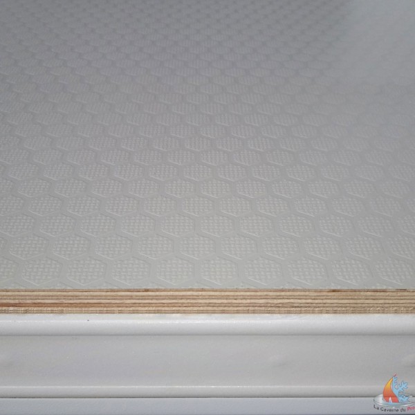 Sol renforcé en bois multiplex 12mm, recouvert d’une résine phénolique antidérapante "alvéolée", supportant une charge de 4000 kg/m² (140kg de charge ponctuelle).