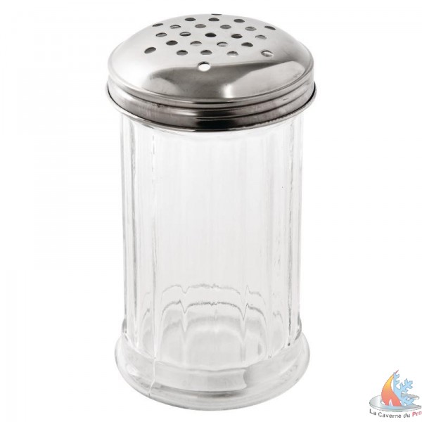 Un grand récipient en verre pour le sucre en poudre possédant un couvercle en acier inoxydable avec plusieurs trous de 4mm, pour doser la quantité de sucre; idéal pour les cafés.
